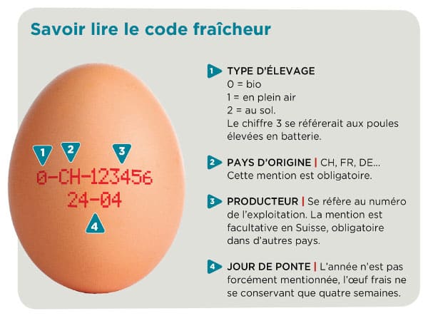 Sur chaque œuf vendu légalement, figure un code. Il commence par des lettres qui indiquent le pays d’origine. En Suisse, on retrouve le plus souvent la mention CH. En France, FR.